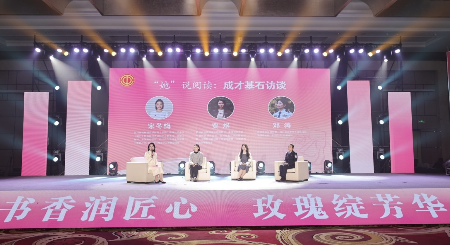 活动特别设置“‘她’说阅读:成才基石访谈”环节,三位优秀女性讲述了阅读如何成为个人成长与职业发展的基石。全国劳动模范、四川省机械研究设计院(集团)有限公司技术研究中心副主任宋冬梅,分享了她在科研攻坚最艰难时,从《人生海海》中收获精神力量、打开思维视野的故事;百花文学奖得主、四川省地质局宣传处副处长贾煜,讲述了她在地质勘探一线,将地质与文学跨界融合,让“地质科幻”成为个人作品独树一帜标签的历程;四川省公安厅十佳宣传舆论理论教官、射洪市公安局民警邓涛,讲述了自己带着阅读走进校园,让法治的底线在文学的土壤中扎根,提灯照亮孩子的未来、用心守护花开的初心。